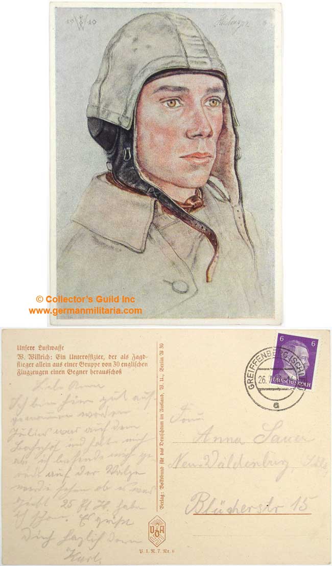 PHYSICAL DESCRIPTION: Roughly, 10.5cm x 15cm, mid- weight card stock, full color artwork postcard features a close up profile of an unknown young fighter pilot wearing a flight helmet and flight suit in the foreground with Willrich’s unique "W" initial cypher interspersed with the date, "1940", in the background. The reverse of the postcard has brown printed Gothic script which includes, "Unsere Luftwaffe. Ein Unteroffizier, der als Jagdflieger allein aus einer Gruppe von 30 englischen Flugzeugen einen Gegner herausschoß". (Our Air Force. An Unteroffizier, who as a lone fighter pilot, shot down one of a group of 30 English aircraft). The reverse also has additional printed script that includes, "Verlag: "Volksbund für das Deutschtum im Ausland", (Publisher: National League for Germans Abroad). The postcard was produced by the VDA, as number six in the "P.1 R.7" series of fund raising postcards. The postcard has been posted and filled out, but remains a nice example.