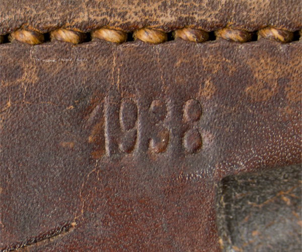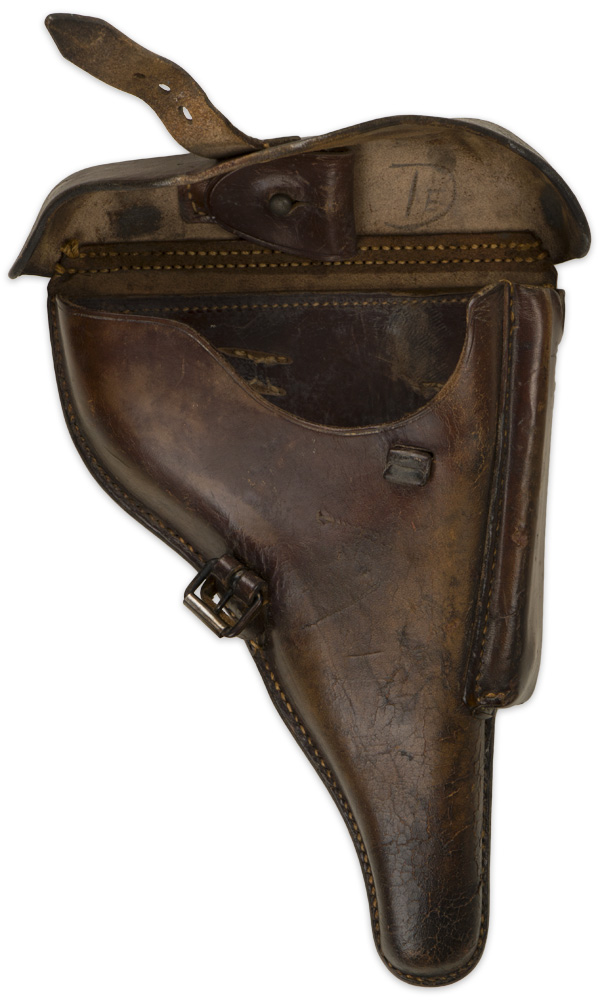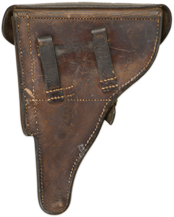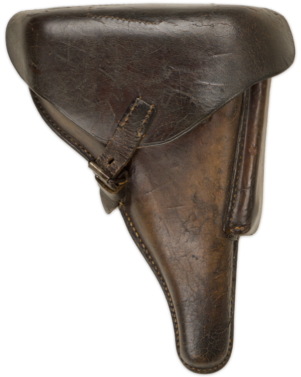 PHYSICAL DESCRIPTION: Smooth, chocolate brown, moulded leather hard-shell holster for the standard 4" barrel P08 Luger. Holster features a top scalloped flap with horizontal stitched hinge to reverse and a slightly diagonally angled stitched on closure strap to obverse. Closure strap attaches to leather reinforced magnetic pronged roller buckle stitched to holster body. Extra magazine pocket stitched to holster front edge with semi-circular cut-out to top edge for ease of accessing extra magazine. Internal quick release pull strap inserted through small horizontal slash to holster front. Reverse with dual, slightly diagonally angled, belt loops stitched in place. Reverse of holster with impressed markings including a 1938 date with faint "C.WEISS & BRAUNSCHWEIG" circular maker mark and Waffenamt on reverse. A name has been hand carved into the leather on the real panel as well. Holster is in overall good condition with light chafe wear and surface scratches.
