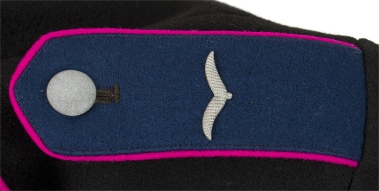 PHYSICAL DESCRIPTION: Superb quality, double breasted, black wool construction. Blue collar with pink wool piping. Sew on shoulder straps for the rank of Feuerwehrmann. Sleeve eagle with original stitching to the upper left sleeve. All buttons are complete and look to have original stitching. Chest size 40". The example was used in the Berlin Luftministerium building! Superb condition and rare to find!