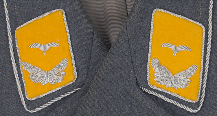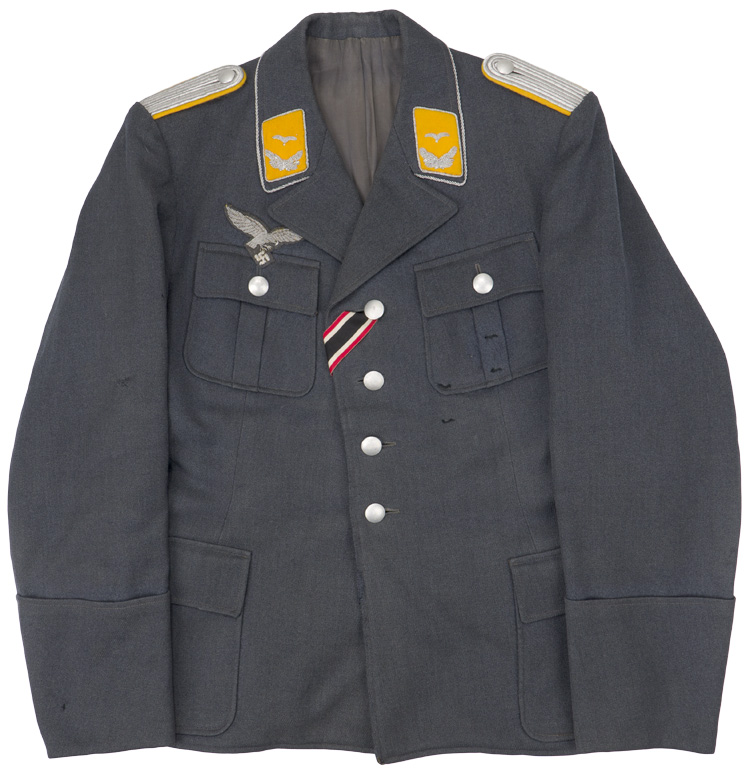 PHYSICAL DESCRIPTION: Private purchase, 1935 pattern, Luftwaffe blue/grey, wool/rayon blend construction tunic with a pronounced whipcord weave. The tunic features a vertical, four button front closure with small, upswept, fold back lapels and a lay down collar. The tunic has four, pleated, patch, front pockets with straight edged button down flaps. The right breast has a hand embroidered Luftwaffe eagle in bright silver/aluminum wire threads with grey cotton thread accents on a cut out blue/grey wool base. The eagle is neatly handstitched to the tunic. Original award loops for two breast badges. KVK2 Ribbon to button hole. The straight cut sleeves have deep fold back French cuffs which are tacked in the upright position at both the inner and outer sleeve seams. The tunic has sewn on shoulder boards of bright silver/aluminum Russian braid on golden yellow wool waffenfarbe bases. The forward edge of the collar is trimmed in bright, twisted, silver/aluminum cording. The collar has golden yellow wool collar tabs with a single hand embroidered rank "gull" and oak leaf wreath all in bright silver/aluminum wire threads. The collar tabs are also trimmed with bright, twisted, silver/aluminum cording and are hand stitched to the collar. The interior of the tunic is fully lined in grey rayon with off white, striped sleeves. The buttons are all the bright, silver washed, pebbled magnetic sheet metal type and appear to have their original stitching. One small sewing repair to the right sleeve. The tunic is roughly size 34" chest. One tiny sewing repair to the lower left pocket. Nice worn and used example showing the expected age and wear. Very decent example with all original insignia application.