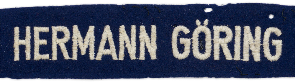 PHYSICAL DESCRIPTION: Deep, navy blue, doeskin wool construction cufftitle with machine embroidered block letter Latin script, "Hermann Göring" in light silver/grey threads. The cufftitle is roughly 32mm wide and roughly 40cm long. A few tiny moth holes. Uniform removed.