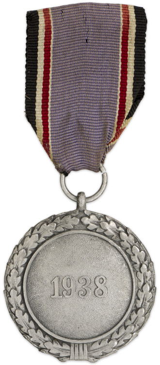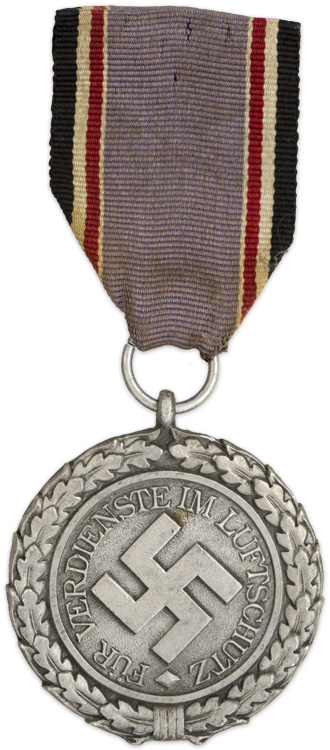 PHYSICAL DESCRIPTION: Roughly, 38m diameter, early, die struck aluminum construction award. The circular award features an embossed oak-leaf wreath to the outside edge encompassing an embossed, canted, swastika on a subtly pebbled field encircled by the embossed, Latin script, "Für Verdienste im Luftschutz", (For Meritorious Service in Air Defence), to the obverse. The reverse also has the embossed, oak-leaf wreath to the outside edge encompassing the embossed, institution date, "1938", also on a subtly pebbled field. The medal loop and ribbon suspension ring are both intact and come complete with a piece of original ribbed rayon ribbon.