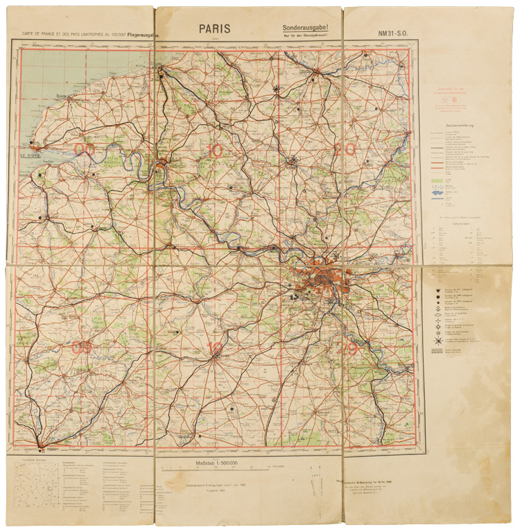 PHYSICAL DESCRIPTION: Roughly, 59cm x 57cm, 1:5 000,000E scale, a single sided, multi-color, yellow tinged, oilcloth construction, flight navigational map featuring France. The map shows all the topographical features such as elevations, rivers, lakes and seas and also shown are villages, towns and cities, as well as the road and rail networks. The map also has an over-printed, longitude degree markings and a repeating, square grid scale with the corresponding reference location numeral to each. Printed along the top is "Carte de France et des pays limitrophes au Normale Auegabe" and "Sonderausgabe (Special Edition)" On the reverse is hand written in black ink "M1:500 000 Paris." It is in overall very good condition with minor age toning. There is some minor fraying along bottom edge.