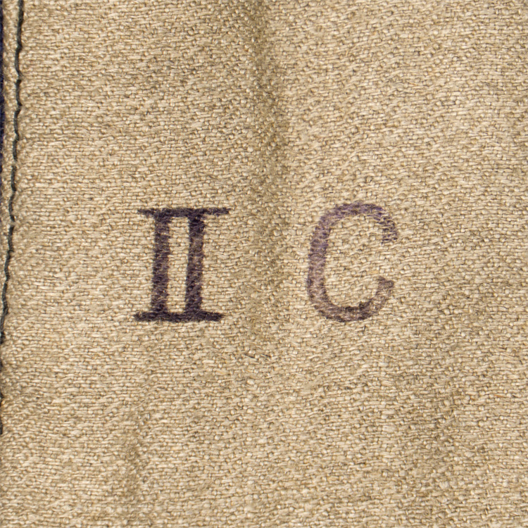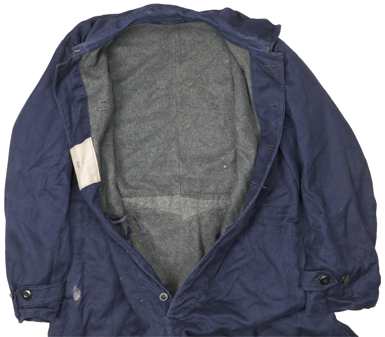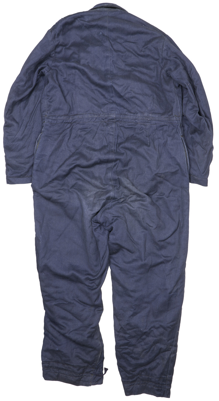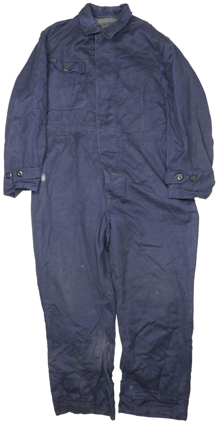 PHYSICAL DESCRIPTION: One piece, pull over, blue cotton/rayon construction coveralls with an HBT, (Herring Bone Twill), weave. The coveralls feature an eight button, vertical, front closure running from the crotch to the neck with a single metal hook and eye at the front center of the lay down collar. The front closure has a small overlapping panel on the left hand side which results in hiding the buttons when closed to insure they didn’t catch on anything. The breast panels have each have a vertical, tapering dart and the right breast has a patch pocket with a straight edged button down flap. Chest size 38. All original buttons and stitching.