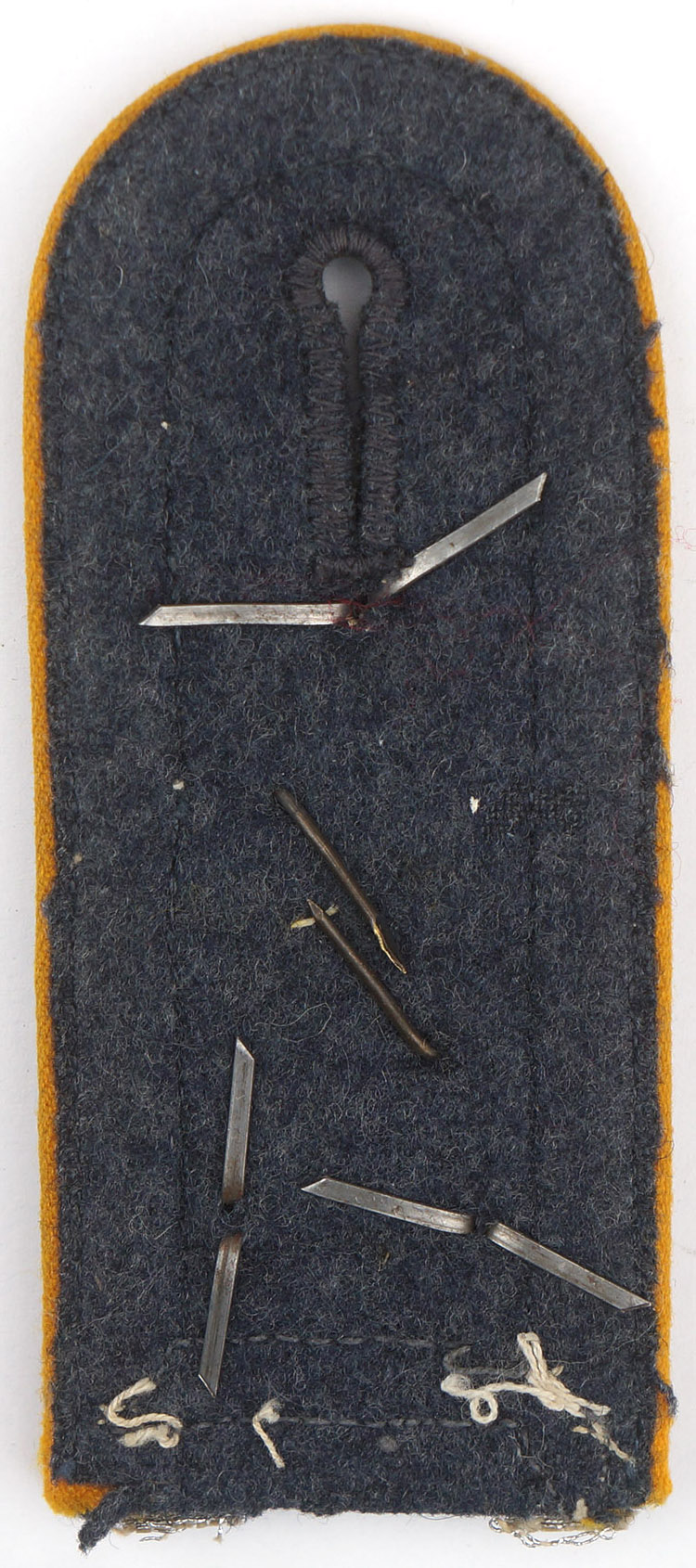 PHYSICAL DESCRIPTION: Luftwaffe blue/grey wool construction, sew on shoulder strap features bright, silver/aluminum, waffle patterned, NCO’s tress to all the outside edges, three, stamped, natural aluminum rank pips and golden yellow rayon waffenfarbe piping to each. Stamped alloy cypher featuring overlapping, stylized initials, "KS", indicating Kriegsschule, (War School).