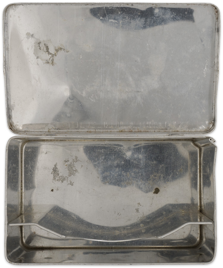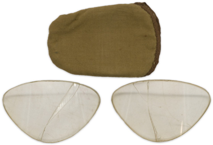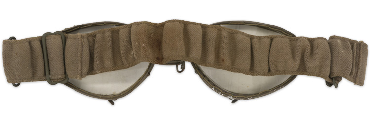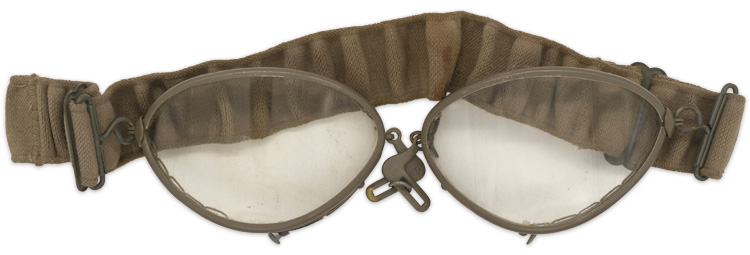 PHYSICAL DESCRIPTION: Standard teardrop, aviator style lenses with separate grey painted aluminum frames. Protecting rubber eye sockets are missing as well the the screw/screws that connects the two sections together. Nice original strap, spare lenses (broken) and original case. Maker marked and dated for 1939.