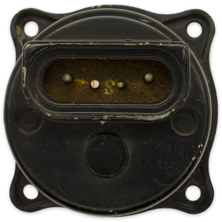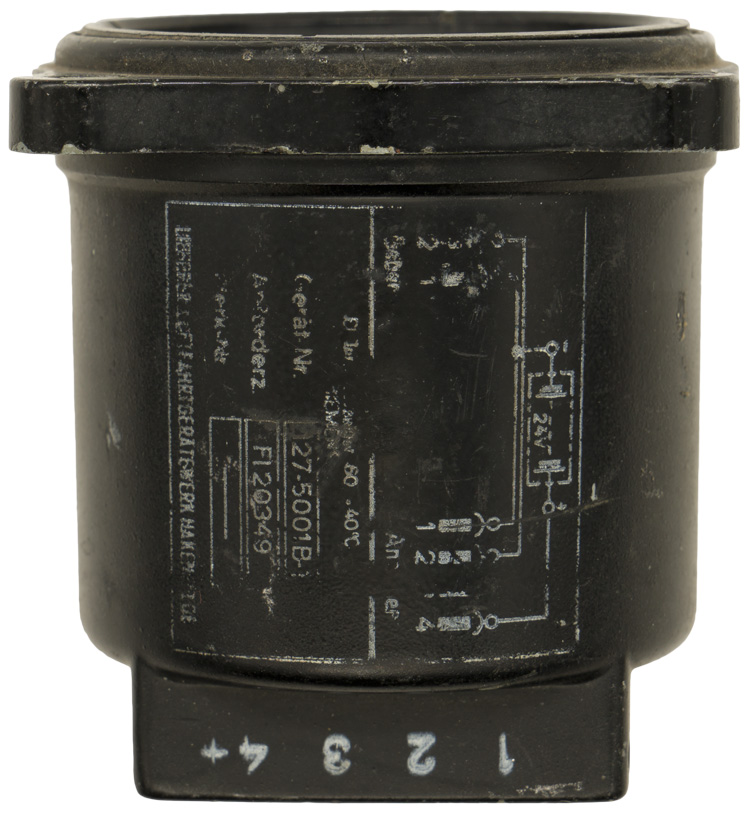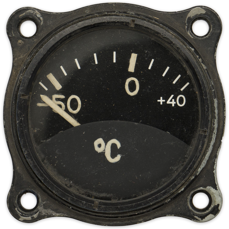 . (Anzeiger)Outside & intake Air Temperature gauge. Roughly 55mm diameter by 50 in depth, black painted, tooled alloy, molded black bakelite and clear glass construction. Back grounded face with white printed numerals running from, "-50" to "+40". The clear celluloid face covering is still intact. The base of the indicator has an extended, screw holed, tab at all four corners to secure it to the cockpit dashboard. Original data plate intact. FL 20349 as used in the following aircraft, Ju52, Ar234, Do24, Go229, Ju88c-6, Ju388 and Me262.