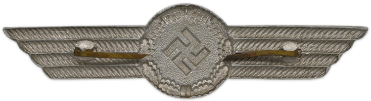 The German armed forces had a tradition, dating from the 1700's, of maintaining a separate branch of Administrative Official’s attached to the army to oversee all administrative functions, thus freeing up active army Officers and allowing them to concentrate on actual military matters. The Officials were responsible for a wide variety of administrative tasks from Court Martial, Librarian, Supply, Technical and Meteorological Services, to School, Barracks, and Hospital administration. On it’s inception the Luftwaffe also established an Administrative branch of service that included the Feuerschutzbeamte der Luftwaffe, (Fire Protection Officials of the Air Force). One function of the Feuerschutzbeamte was to provide fire fighting and protection services to all Luftwaffe airbases, depots, installations etc. The Feuerschutzbeamte utilized civilian employees mainly drawn from civil fire departments. Both the officials and the civilian employees were not granted the status of soldiers but were classified as Angehörige der Luftwaffe, (Members of the Air Force). The officials and the civilian employees originally wore dark blue uniforms and headgear that was similar to the Feuerschutzpolizei, (Fire Protection Police), with different insignia for each group. Regulations of November 1940 altered the officials uniform to the standard Luftwaffe blue/grey, with different insignia, although the civilian employees continued to wear the dark blue uniform and headgear. The headgear worn by the officials and civilian employees included a visor cap that was basically identical to the standard Luftwaffe visor cap but in a different color and different insignia. The civilian fire brigade personnel were allocated crimson waffenfarbe, (Branch of Service Color), which was displayed as piping on EM/NCO’s visor caps.PHYSICAL DESCRIPTION: Roughly 110mm winged aluminum wreath with a swastika to the center. Complete with original prongs. Scarce.