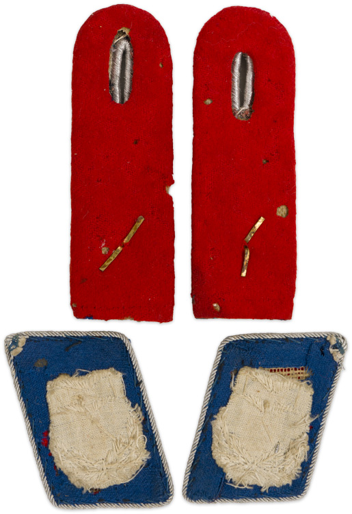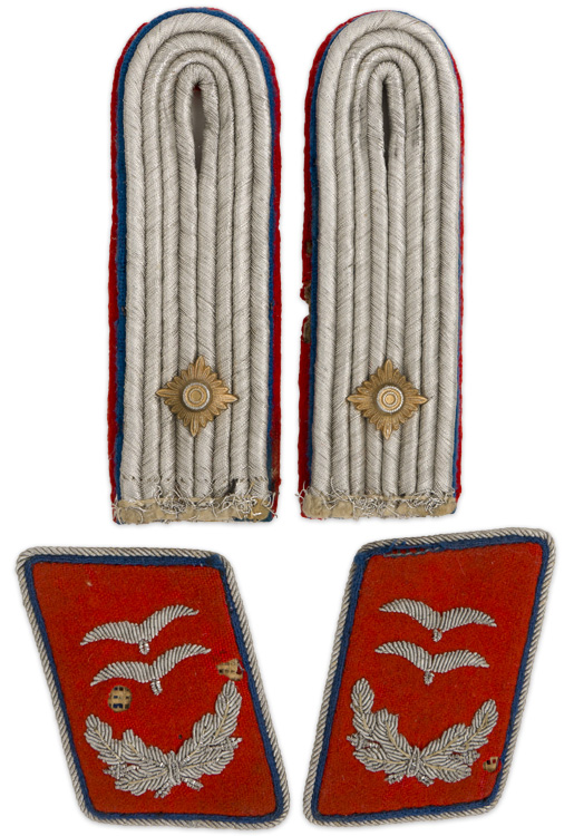 The Reichsluftwaffe, (National Air-Force), was officially established on February 26TH 1935 as the third branch of service of the Wehrmacht, (Armed Forces). On March 9TH 1935 the formation of the new Reichsluftwaffe was announced to the foreign press and on March 16TH conscription was reintroduced for all three branches of service. On May 21ST 1935 the Reichsluftwaffe designation was altered to Luftwaffe, (Air-Force). On April 14TH 1935 collar tabs were adopted by the newly formed Luftwaffe which followed the basic pattern of the collar tabs that had been utilized by the DLV, Deutscher Luftsportsverband, (German Air Sports Association), the Luftwaffe’s clandestine civilian forerunner. The collar tabs were worn in matching pairs and indicated the branch of service and rank of the wearer. The different branches of service within the Luftwaffe were allocated specific, identifying, waffenfarbe, (Branch of Service Color), with bright red being chosen for personnel serving with the Flugzeugabwehrartillerie, (Anti-Aircraft Artillery), units which was generally displayed as the base color of the collar tabs. The body of military Reservist, which had been abolished by the Treaty of Versailles in 1919, was re-established by the Wehrgesetz, (Military Service/Defence Law), of May 21ST 1935 which established basic regulations concerning military call-up and discharge, service classifications and numerous other military service requirements and obligations. Personnel on Reserve status were distinguished by the addition of a mid-blue nebenfarbe, (Secondary Color), which was displayed as piping on the collar tabs and as an underlay on the shoulder boards. Regulations of September 7TH 1939 abolished the secondary colors on the insignia for Reserve personnel that were called up for active service and they were to wear the uniform and insignia of the unit assigned to. Of Note: The Flak arm is often viewed as a secondary arm of service within the Luftwaffe when in fact during the war between half and two thirds of all Luftwaffe personnel served in a Flak unit. Also Of Note: Further production of collar tabs was discontinued by regulations of October 12TH 1944, although on hand stocks were to be issued and collar tabs already issued continued to be worn.PHYSICAL DESCRIPTION: Nice matched set of tabs & sewn on boards to a Reserve Oberleutnant. Some mothing.