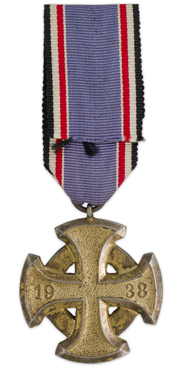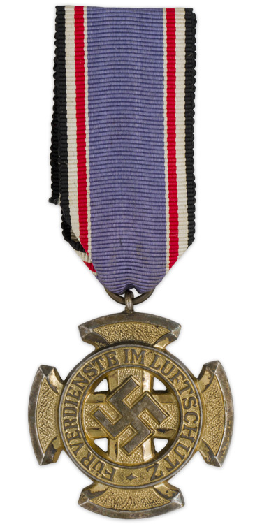 PHYSICAL DESCRIPTION: Die struck alloy construction award with a gilt wash. The award features cross with a swastika to its center encircled by the embossed, Latin script, "Für Verdienste im Luftschutz", (For Meritorious Service in Air Defence), to the obverse. The reverse also has the embossed institution date, "1938". The medal loop and ribbon suspension ring are both intact and comes complete with a piece of original ribbed rayon ribbon. Maker marked L/18 for B.H. Mayer's, Hofkunstprägeanstalt Pforzheim. Scarce.