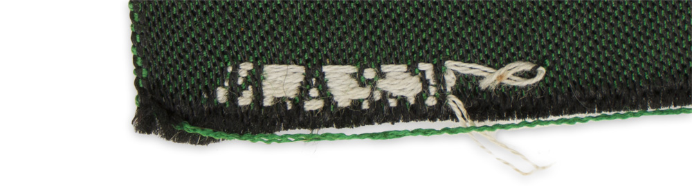 PHYSICAL DESCRIPTION: Full length, woven green rayon construction cufftitle with machine woven Gothic script, "L.S. Warndienst", (Air Raid Warning Service), in silver/grey rayon threads. The top and bottom edges of the cufftitle have interwoven rows of reinforcement stitching and both ends have dual-ply machine stitched seams. One end of the cufftitle has the machine woven manufacturer’s initials "K.R.A.N.", in silver/grey rayon threads.