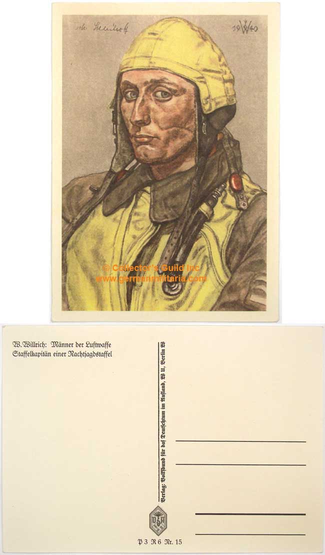 Roughly, 5 7/8" x 4 1/8", (4.8cm x 10.4cm), mid- weight card stock, full color artwork postcard features a close up profile of a night fighter wearing a flight helmet and flight suit with a bright yellow protective flight helmet cover and a bright yellow life jacket, in the foreground with Willrich’s unique "W" initial cypher interspersed with the date, "1940", and the subject’s name, "Joh. Steinhoff", in the background. Just visible is the "wing" and "bar" rank insignia on the flight suit sleeve which appears to indicate the rank of Oberleutnant. The reverse of the postcard has black printed Gothic script which includes the artist’s name, "W. Willrich:", and, "Männer der Luftwaffe Staffelkapitän einer Nachtjagdstaffel. (Men of the Air-Force Squadron Commander of a Night Fighter Squadron). The reverse also has additional printed script that includes, "Verlag: "Volksbund für das Deutschtum im Ausland", (Publisher: National League for Germans Abroad). The postcard was produced by the VDA, as number fifteen in the "P.3 R.6" series of fund raising postcards. The unused postcard is in overall very good condition with minimal age toning.GRADE ****1/2 PRICE $42.00