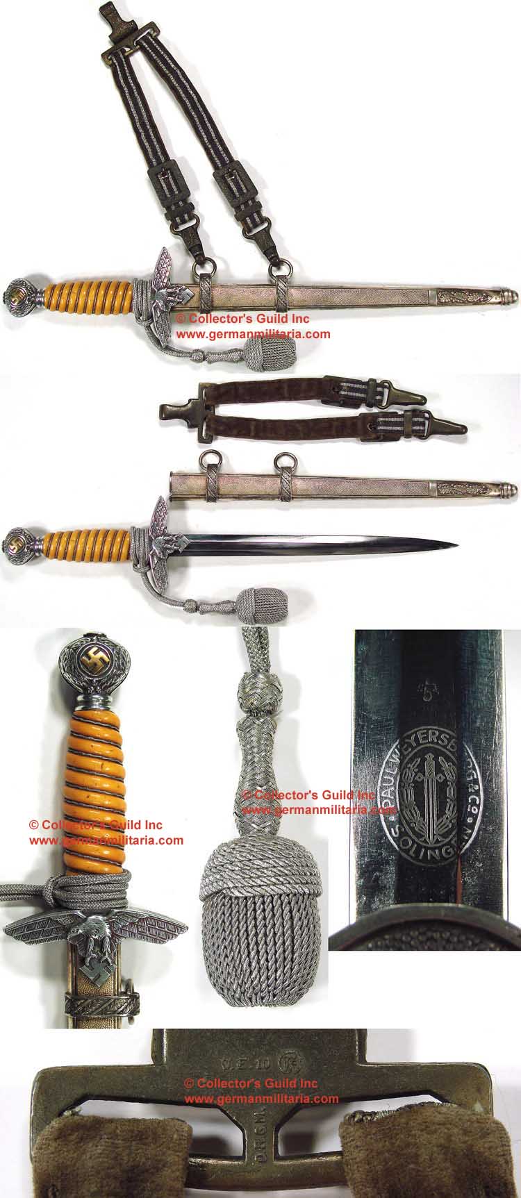 PHYSICAL DESCRIPTION: The drop forged and tooled steel, cast alloy and molded bakelite, multi-piece construction dagger, including the hilt is roughly, 15 1/4", (38.7 cm), long, and features a roughly, 10 1/4", (26 cm), long, nickel/silver plated, double edged, drop forged steel construction, stiletto style blade with a flat central plane. The blade is in overall good condition with light scabbard runner marks and some light surface spotting and some of the original cross-graining is still visible. The reverse ricasso is well marked with the acid etched manufacturer’s name, location and logo consisting of a vertically oval cartouche with the manufacturer’s name and location, "Paul Weyersberg & Co. Solingen", encompassing a downward pointing broadsword, flanked by a stylized, opened top, laurel leave wreath. The reverse ricasso also has a stamped, waffen-amt, (Ordnance Office, {Armorer’s Inspection Mark}), mark that would seem to indicate a bestowed dagger, as opposed to a private purchase example. The pebbled, blackened leather washer is still intact. The dagger has a well defined, nicely detailed, cast, aluminum crossguard, ferrule and pommel all intact. The crossguard features a stylized, national eagle with downward -angled, out-stretched, wings, clutching a canted swastika in it’s talons to the obverse with a random, pebbled field to the reverse. The top edge of the crossguard has an ornate, engraved, oak-leaf and acorn pattern to each side. The cast ferrule has a repeating, embossed, diagonally angled, oak-leaf and acorn pattern. The orb shaped pommel features an embossed oak-leaf and acorn pattern encompassing a dual encircled, embossed, canted, fire gilted, swastika on a pebbled background field to both the obverse and the reverse. The fire gilted finish to both of the pommel swastikas is retained about 95%. Of Note: Typically the gilt finish to the pommel swastikas is worn off. The crossguard, ferrule and pommel all show light age tarnish which only enhance the detailing. The dagger has a molded, orangish/yellow, bakelite grip with the correct, fine, twisted, multi-strand, silver/aluminum wire wrap inset into the diagonally angled grooves. The grip is in overall good condition with light age and usage toning and a few small surface scuffs and scrapes. The dagger comes complete with it’s original, nickel/silver plated, tooled, magnetic sheet steel scabbard. The scabbard features a pebbled field to both the obverse and the reverse with smooth side panels. The scabbard has an ornate, embossed, oak-leaf pattern to both the obverse and reverse of the bottom tip. The scabbard also has dual, sweated on, aluminum alloy hanger suspension bands with an ornate, embossed, repeating oak-leaf pattern to each. The steel, hanger suspension rings are both intact. The scabbards top throat has a two, small, counter sunk, retaining screws, positioned on each, upper side edge. The scabbard shows light to moderate age and usage tarnish and some small spots of wear to the base metal. The dagger comes with a woven, silver/aluminum, portepee, consisting of an interwoven silver/aluminum cord, slide, stem, crown and ball. The slide and stem are both woven with a repeating "V" pattern while the crown is in horizontally laid, twisted, silver/aluminum braid with the ball in vertically laid, twisted, silver/aluminum braid mounted on an internal, formed base. The portepee is in overall very good condition with minor age and usage toning. Also include are nice quality, deluxe pattern, Luftwaffe officer’s dagger hangers consisting of two, machine woven, blue/grey rayon straps with a central, waffle pattern weave, flanked by fine, parallel, vertical, bright, silver/aluminum edges stripes. The straps are both roughly, 3/4", (2cm), wide, with one being roughly, 6 1/4", (15.8 cm), long and the other being roughly, 7 3/4", (19.8. cm), long. The reverse of the hanger straps are backed with a worn, protective olive green velvet. The hangers have stamped and molded alloy construction, fittings consisting of a friction, attachment clip to the top, with dual, cut-outs for securing the hanger straps. The top of the hanger straps are machine stitched to the cut-outs of the top friction clip. Both of the hanger straps also have rectangular framed, opened, pronged, buckles, strap retaining loops and spring loaded, pressure clips to the bottom ends for attaching the hangers to the scabbard hanger rings. The top attachment clip, buckles, retaining loops and the bottom attachment clip all have ornate, embossed, oak-leaf and acorn patterns. All the alloy fittings have mostly reverted to the flat matte grey of the base metal with slight hints of what appears to be a gilt wash, although in likelihood it is a discolored, protective lacquer and not indicative of General’s ranks. All three of the attachment clips are all well marked to the reverse with either the impressed or embossed initials, "DRGM", indicating, Deutsche Reichs Gebrauchs Muster, (German National Registered Design). Interestingly the reverse of the top attachment clip also has an embossed RZM logo with a single, opened bottom, circular border and additional markings consisting of, "U.E", indicating, "Uniformeffekten Erlaubnißschein, (Uniform Accessories Licence), and the manufacturer’s numerical code, "10". Of Note: It appears the combined RZM/U.E., markings were utilized circa May 1933 to March 1935 when the original controlling authority of the SA Quartermaster’s Department was converting into the RZM, Reich Zeug Meisterei, (National Equipment Quartermaster). During this time period manufacturers were assigned a U.E. code numeral until March 1935 when the RZM underwent internal restructuring and began assigning specific divisional and sub-divisional manufacturers, contractual identifying letters and a revised set of numerical codes. It also appears there was some confusion amongst the manufacturers as to exactly what items fell under RZM/UE contro
