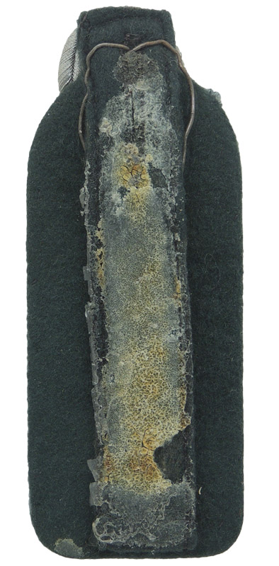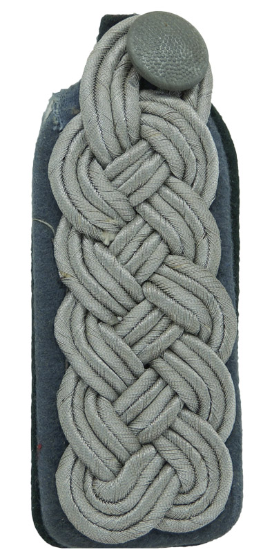 Slip on shoulder board of bright, interwoven, silver/aluminum braid on a dark green wool waffenfarbe base with blue/grey wool nebenfarbe. Shoulder board signifies an official with the equivalent rank of Major. Glue spots to the reverse indicating it was most probably in a scrap book at some point. Meteorological technician.