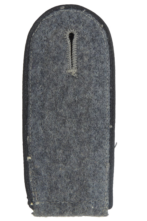 PHYSICAL DESCRIPTION: Luftwaffe blue/grey wool construction, slip on shoulder strap with black rayon waffenfarbe piping. The bottom of the strap and the slip on retaining tongue are also in Luftwaffe blue/grey wool. The bottom of the slip on tongue has a light weight, black cotton/rayon blend reinforcement panel machine stitched in place. The shoulder strap is in overall very good condition with minimal age and usage toning. The lack of the RLM cypher would indicate the strap was utilized by construction personnel.
