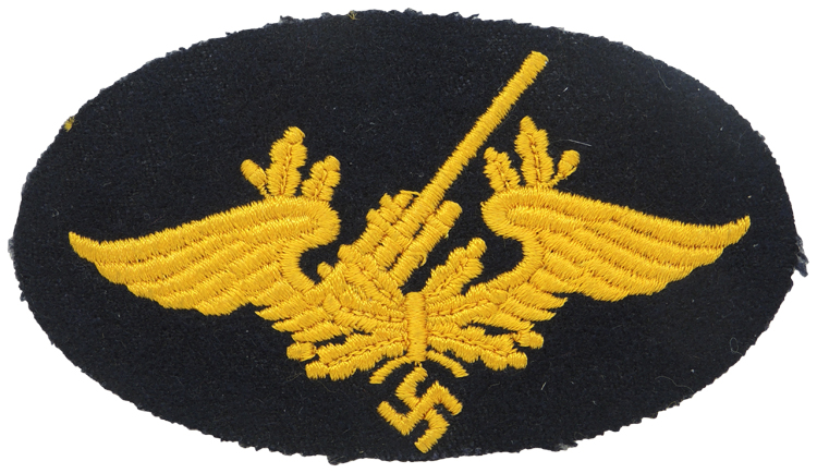(Flakartillerie Tätigkeitsabzeichen)Identical in design to the Luftwaffe pattern, but in yellow and blue. Badge consists of a horizontally oval, dark navy blue wool base with a machine embroidered likeness of a large 88mm flak gun barrel flanked by stylized wings, superimposed on an opened top, oak-leaf wreath with a canted swastika to the bottom center all in golden rayon threads. Scarce!