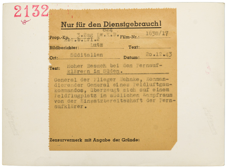 A 18cm x 13cm, black and white press photograph. Nice image of General der Fleiger Alfred Mahnke in Southern Italy. Photo is dated December 12th, 1943.