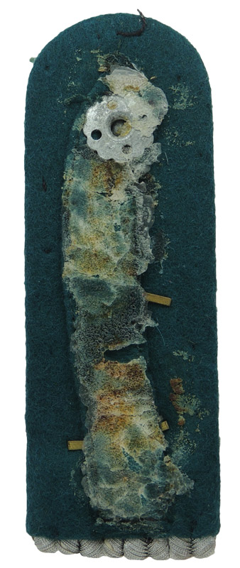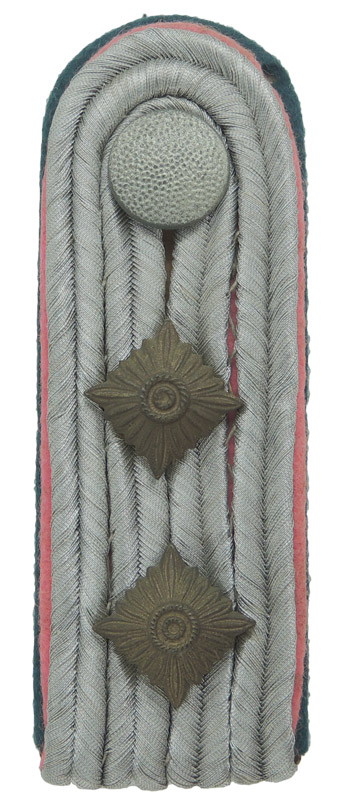 PHYSICAL DESCRIPTION: Slip on shoulder board of bright, interwoven, silver/aluminum braid on a dark green wool waffenfarbe base with pink wool nebenfarbe, (secondary color). Double rank pips. Shoulder board signifies an official with the equivalent rank of Hauptman. Glue spots to the reverse indicating it was most probably in a scrap book at some point.