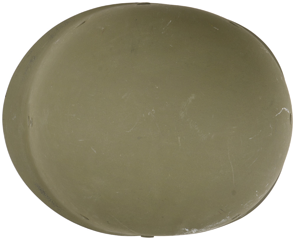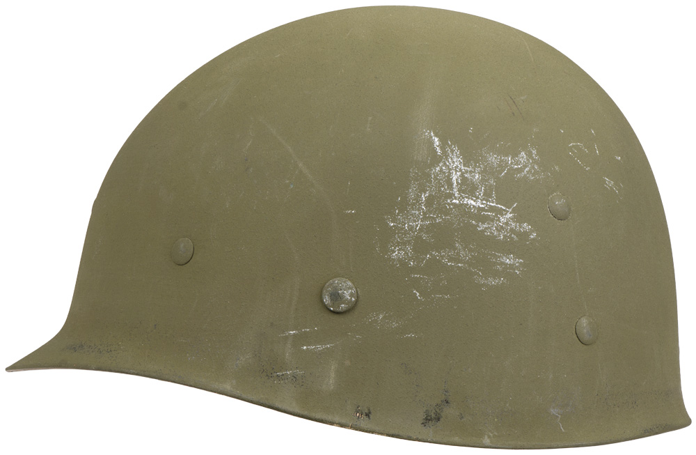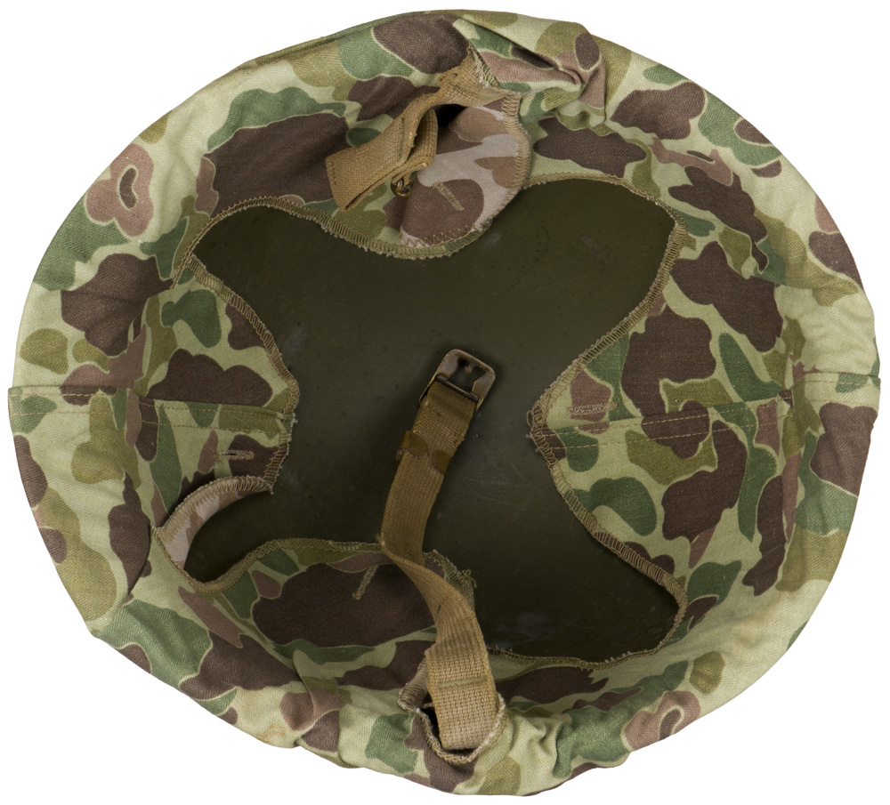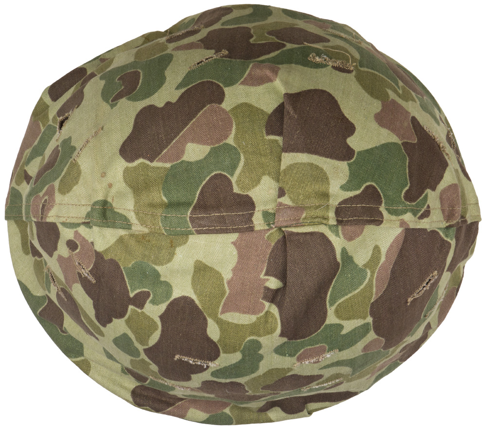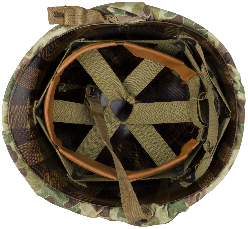The M-1 helmet was developed as a replacement for the M-1917 helmet that had seen use since WW1. It was designed by using the crown of the M-1917, removing the brim and adding extensions to protect the neck, ears, and forehead. The resulting form was then used as a template for the production of a helmet body from a single piece of Hadfield Manganese Steel. The liner and suspension were developed after a modified Riddel Football helmet. The M-1 helmet was approved for production in June of 1941. Early models had solid loops (fixed bale) for the chin straps but they broke off to often and were replaced with a moveable hinged loop. The original rim of the helmet was made of stainless steel but it was found that the paint that was used would wear off to easily and leave a shiny reflective surface. To remedy this they switched to a Hadfield Manganese Steel and also changed the butt of the rim from the front to the rear of the helmet body. This change took place in October of 1944. The M-1 helmet had the best ballistic characteristics of any helmet developed up to then and could with stand the force from a 230 grain, .45 caliber bullet with a velocity of 800 feet per second.PHYSICAL DESCRIPTION: A two-piece helmet, comprised of a liner and a Manganese shell. The shell retains approximately most of its rough-textured olive drab paint. Fixed bail loops with original chinstrap. The high pressure plastic liner has a dark brown and tan vertical stripe design visible to its interior surface, resulting from its segmented construction, with original paint almost 100% retained. There are six rivets for the "Riddell" suspension system, three for the neck strap, as well as two larger garter stud rivets for the chin strap, and an eyelet to the front center for insignia, are visible to the exterior. All straps are complete and in good condition. Included with the helmet is a USMC pattern cammo cover. Two piece, cotton HBT construction, with printed splotch pattern camouflage. Cover has one central stitched seam with both sides being of identical shape, with extended flaps. The flaps are folded up between the helmet and the helmet liner to secure cover in place. Camouflage patterns consists of four colors to "jungle" side in greens, browns and tans, and three colors to the "beach" side of browns and tans. Superb helmet and cover!