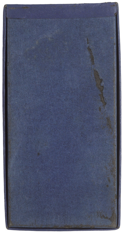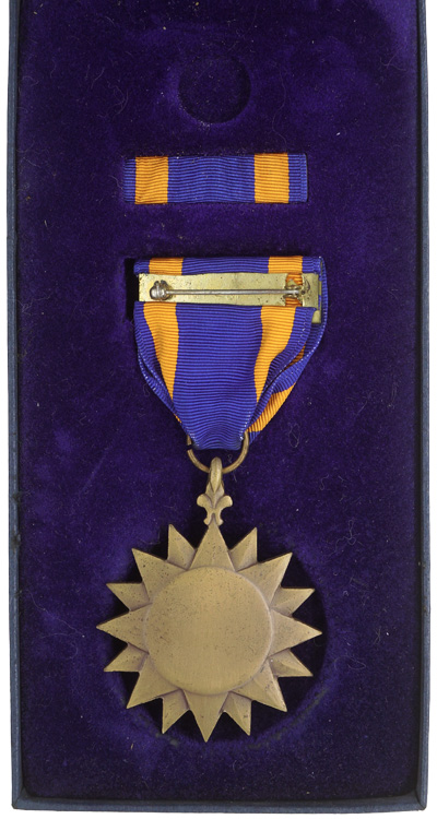 A die-struck bronze metal in the shape of a compass rose with an eagle Volant carrying two lightning bolts in it talons. The medal is not named. It is suspended from a silk ribbon with the original hinged pin to the reverse. Included is the ribbon bar with original hinge pin all cased in a purple lined cardboard box.