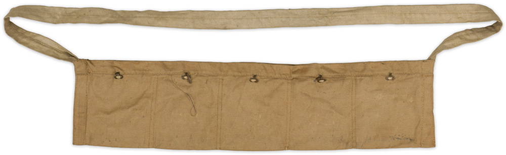 A five pocket, cotton constructed bandoleer to hold 10 rounds of Mark VII .303 ball ammunition. A small copper wire clip is sewn to each pocket to prevent the loss of ammo. The bandoleer is manufacture marked and dated "E.C. Belyea’ "Melbourne" and "1918" but was reissued and dated for "16-12-46." It is also war department marked. The bandoleer shows moderate usage and wear with staining and various markings, but this only makes this a very nice, used and salty example.