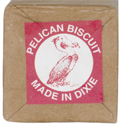 A 22cm x 6cm x 5cm paper wrapped carton of “Pelican Cracker Factory” biscuits. No contents.