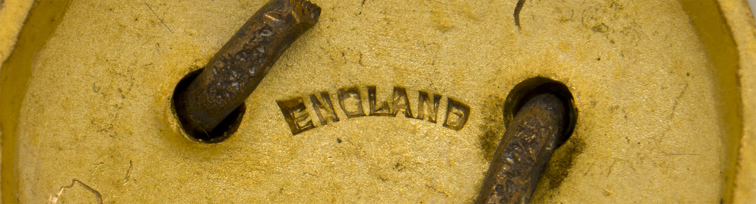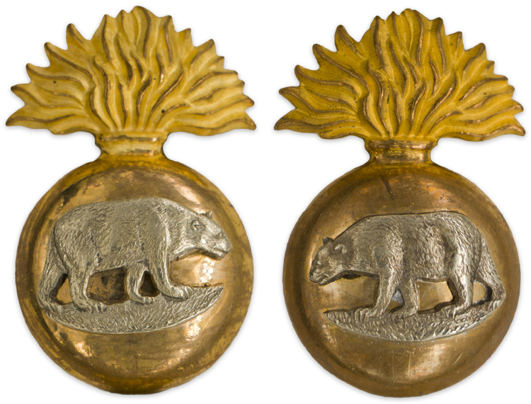 A pair of gilt and silver collar badges in the shape of a "flaming grenade" with left and right facing polar bears. A pair of split pins are to the reverse of each. One is marked "England" to the center.