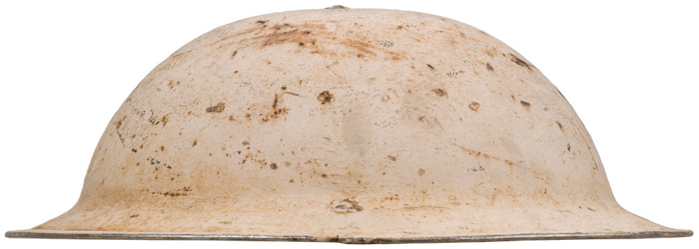 The standard British Infantry helmet, as used throughout World War II, being a modification of the Mk. I helmet introduced in April of 1916 and used during the First World War. Production of the MK II helmet began in 1938 and the first units were delivered to the armed forces in 1939. The helmet retained its predecessor’s shape but improved the steel, liner and chin strap.PHYSICAL DESCRIPTION: South African Manufactured MkII helmet. The three holes on the rim are for the attachment of a sun shield. Nice salty worn and used, good original paint, liner and chinstrap system complete. Shows the expected age and use.