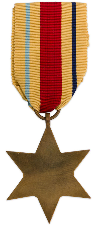 PHYSICAL DESCRIPTION: The medal takes the form of a, bronze colored, six-pointed tombac star, 42mm from point to point, whose uppermost point features a suspension loop. To its slightly domed, obverse center is the stylized Royal Cypher "GRI," with "VI" beneath it, surmounted by a King’s crown and with "The Africa Star" scrolled around it. Its reverse is featureless. The medal has a ring fed through its suspension loop, with its ribbed ribbon passing through the ring. The ribbons colors are a Pale Buff with a central Red stripe and two narrow stripes, Dark Blue to the left and Light Blue to the right. They represent the desert, the Navy, Army and Air Force.