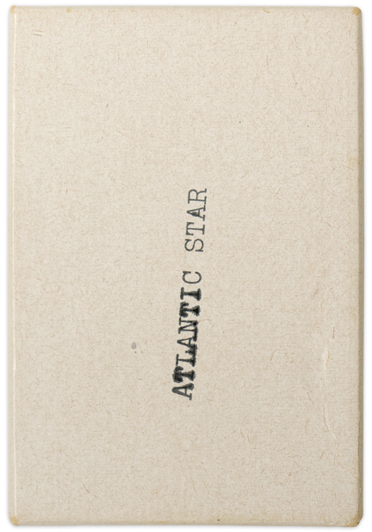 PHYSICAL DESCRIPTION: The medal takes the form of a six-pointed tombac star, 4cm from point to point, suspended from the ring attached to a loop to its uppermost point. To its obverse center is the stylized Royal Cipher "GRI," with "VI" beneath it, surmounted by a King’s crown and with "The Atlantic Star" scrolled around it. The reverse is featureless. The medal comes with original silk ribbon with a shaded and water blue, white and sea green ribbon that is said to represent the Atlantic Ocean and two piece cardboard constructed case.