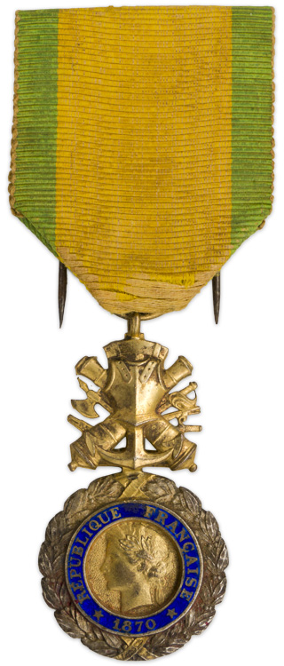 PHYSICAL DESCRIPTION: A circular medal, about 3cm in diameter, with a blue enamel bordered, gilt washed central medallion to the front and back, surrounded by a silver wash laurel wreath. The front of the medallion has a recessed gilt center and is embossed with the profiled head of a laurel-crowned female surrounded by the text in the blue border "Republique Française" and the date "1870". The reverse medallion has a gilt center with the embossed Text "Valeur et Discipline" surrounded by a blue border. To the top of the medal is a hinged, gilt washed, military trophy suspension with a ribbon ring to the top. The trophy is blank to its reverse. The moire ribbon has a yellow center with green stripes to either side edged in yellow. A pair of pins are to the reverse of the ribbon that shows some fraying along the edges.