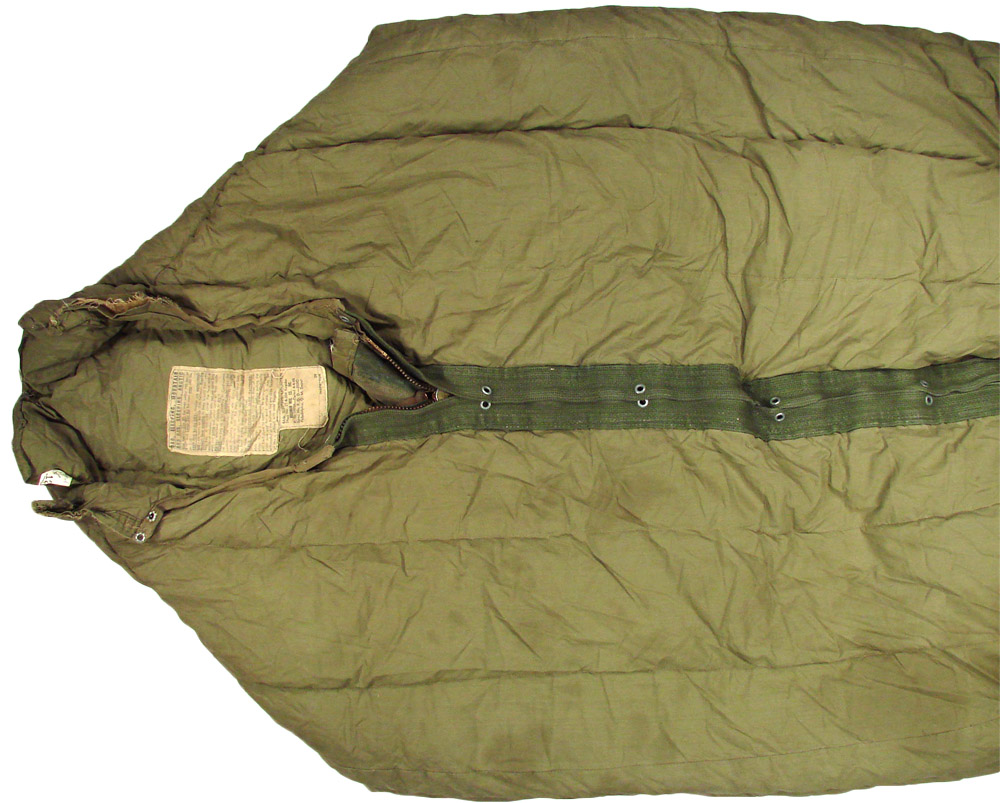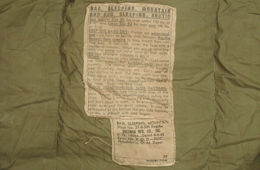 Due to the fact that the mountain soldier was responsible for carrying their own sleeping bag, made it essential to have it as light as possible. It also must be durable, warm and designed for the occupant to get out of quickly. The "mummy" sleeping bag was formed to the shape the body, use less material and less bulky. The M1942 was constructed with a down and feather mixture with a slide zipper and quick release device. The casing is made up of a water repellent balloon cloth with stitching that did not penetrate all the way through, but used alternating inner and outer stitches to a central section of cheesecloth which was used to separate the layers. The seam was reinforced against the cold by the addition of a tubular section of filler placed tightly against it. Inside this bag is stitched a large oil cloth tag with directions of use, a size "Regular", manufactured by "Buchman Mfg. Co. Inc.", "Dated 4-4-45" by the "Philadelphia, Q.M." The length is roughly 75" being 27" wide at the top and 14" at the bottom with a 28" long zipper. Shows period use and wear but overall intact and in usable condition.
