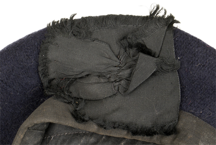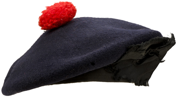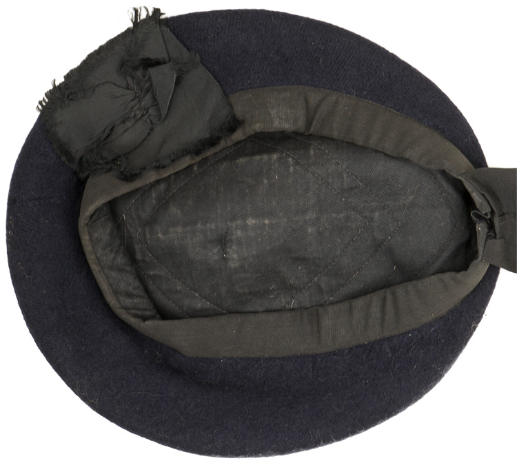 The Balmoral Bonnet, which is known as the Tam o'Shanter, originated in 1915, as a replacement for the Glengarry, to be worn by Scottish troops in combat. A dark blue wool bonnet comprised of a crown with a red coloured wool Touri (pom-pom) to its center, a black silk rosette and tails. The interior is lined with a stitched diamond to the center. The cap shows some moth tracking, but otherwise is in good condition.