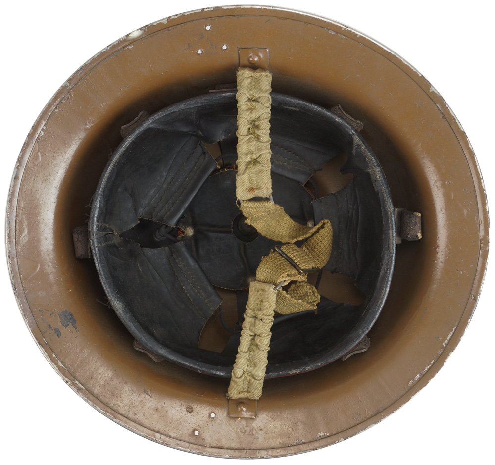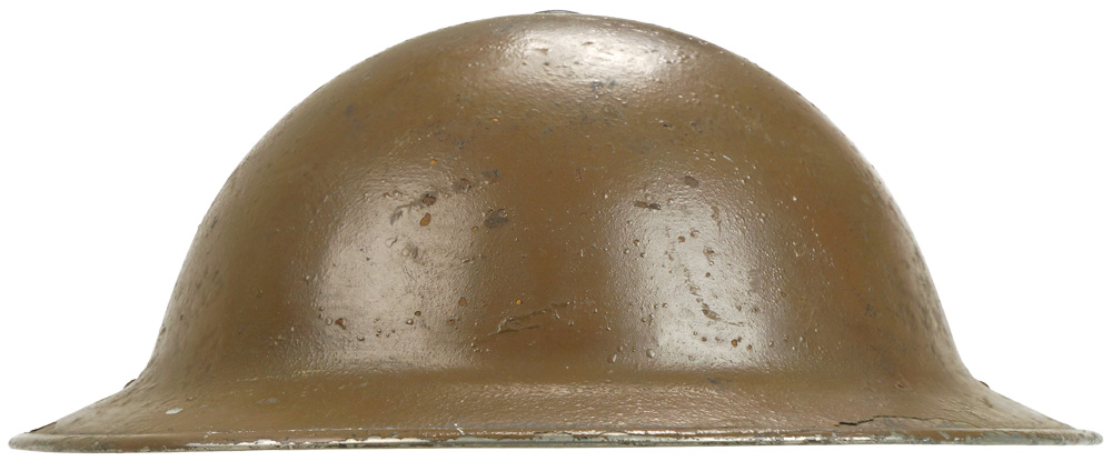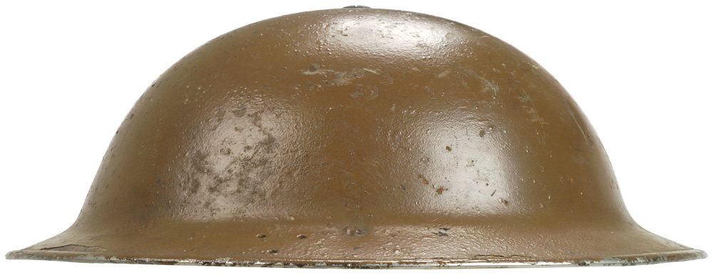The standard British Infantry helmet, as used throughout World War II, being a modification of the Mk. I helmet introduced in April of 1916 and used during the First World War. Production of the MK II helmet began in 1938 and the first units were delivered to the armed forces in 1939. The helmet retained its predecessor’s shape but improved the steel, liner and chin strap.PHYSICAL DESCRIPTION: Decent original brown over paint (painted over top of the black Civil Defence), liner and chinstrap system. Three holes drilled into the visor were issued for British civil defense and were stamped from magnetic mild steel. These where issued as a "stop gap" measure after the British lost so much of it equipment in France in 1940.