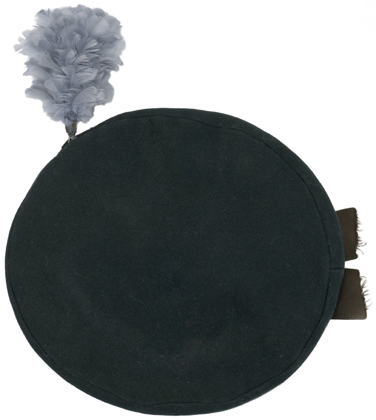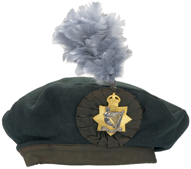 This group consists of a green wool caubeen with an officer’s light blue hackle, bi-metal cap badge on a black rosette and a size 7 1/4. The wool cut away tunic with the front cut out and tapered away toward the hips. Four brass buttons are to the front with a lay down collar and integral shoulder straps. Two breast pockets with scalloped flaps, as well as two hip pockets with straight flaps, with curved fronts that follow the lines of the jacket, are present. All buttons are identical to those running to the front. Matching bi-metal collar dogs represent the Irish Regiment are present to each point. Each shoulder strap has a pair of pips that denote the rank of Lieutenant along with "Canada" brass shoulder tiles. A green lanyard extends around the left shoulder. The manufacture tag has been removed from the interior breast pocket. The chest measures approximately 36". Included is a belt of the same material as the tunic, and a pair of brass belt hooks. A pleated wool kilt in the pattern of the Irish Regiment of Canada with a pair of brown leather straps with the corresponding single prong buckle to each side. A green rosette (or bow) is to the front bottom left. This rosette or bow is worn by Senior NCO’s of this regiment. The interior of waist in fully lined. The straps look to have been replaced/modern. The waist measures approximately 38" and is 23.5" long. Lastly, is a brown leather Sam Browne belt that measures approximately 104.5cm long. Of Note: As per the vendor, the tunic is attributed to, but not named to Capt. R.L. Grout IRC of Vancouver. (Ex Taboika Collection)