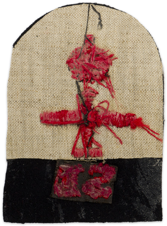 A black wool badge with machine embroidered that measures approximately 6.5cm x 9cm.