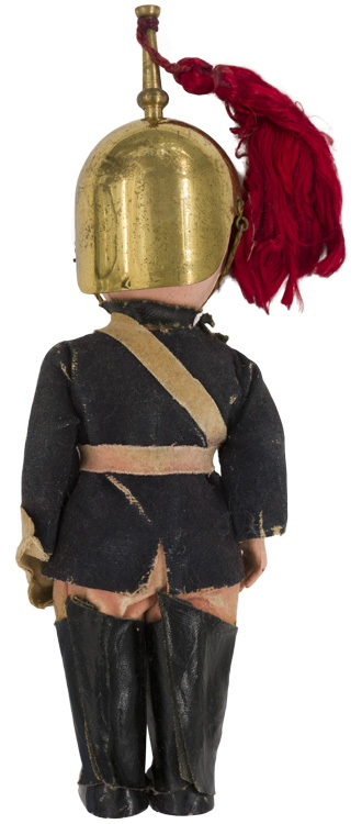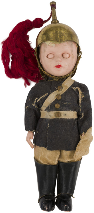 An 18cm tall porcelain doll with no moving parts. Eyelids open and close.