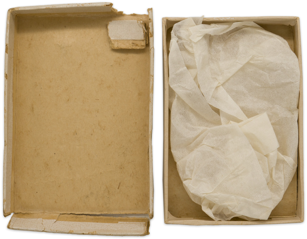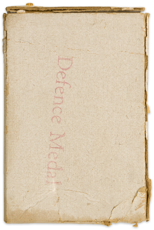A two piece cardboard box with friction top lid that is stamped "Defence Medal". Shows war with some tearing.