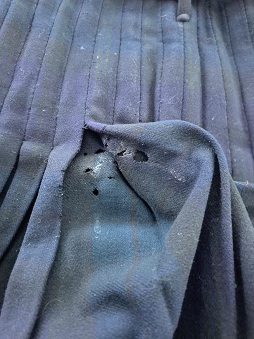 Couple of area of mothing, most hidden inside one of the pleats (see photos). There is some light wear along the trim to the waist. (Ex Taboika Collection)
