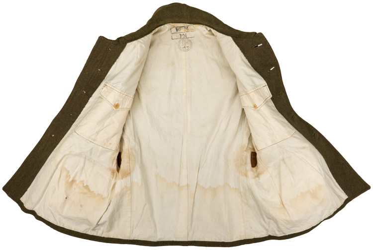 A wool tunic with a five, rounded button front leading to a laydown collar with a single hook and eyelet to the neck opening. Under each collar point is a triangular section of wool that is held secure to a small button, but can be extended across the throat when the collar is turned upward. Collar insignia has been removed, as can be seen by the remaining threads. The shoulder straps have been cut off. A pair of hip pockets are to the front with a fold over angular flap. The interior is lined in a white cotton that is stamped with a cartouche. The chest measures approximately 38". The wool shows typical wear/knapping. A larger moth hole is to the reverse panel.