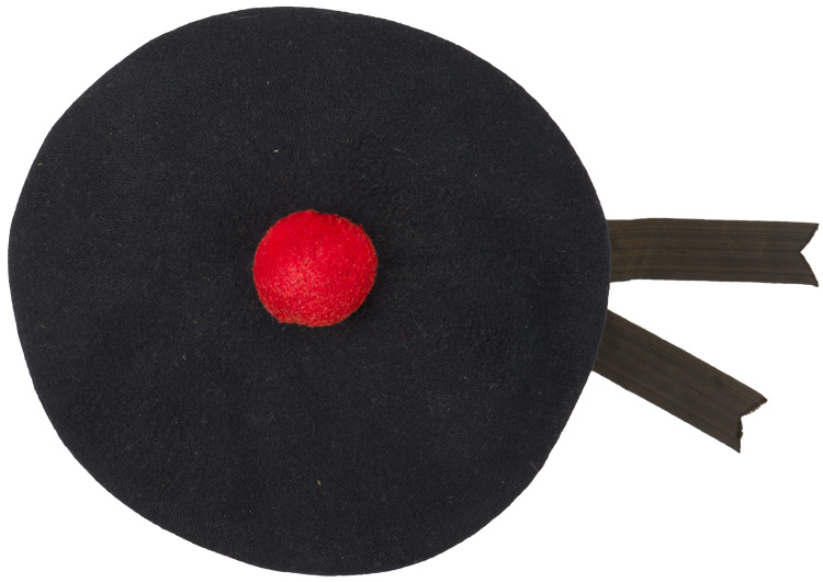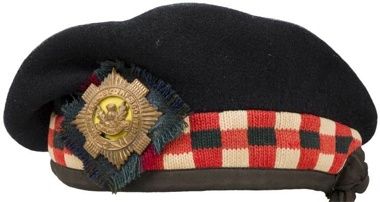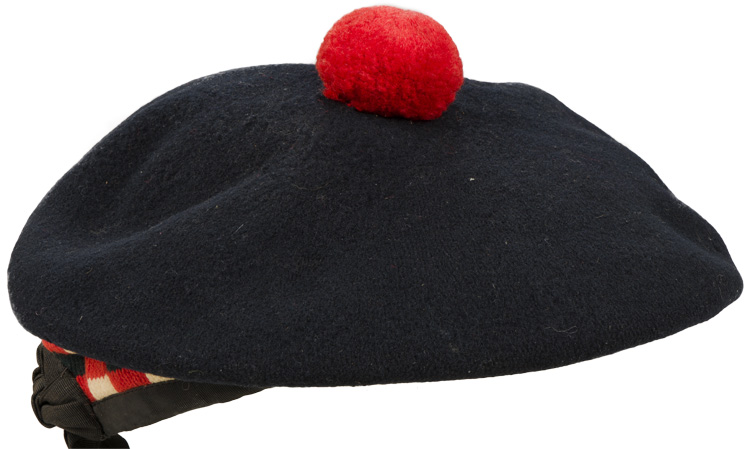 A black wool bonnet comprised of a red coloured wool Touri (pom pom) to its center, with a diced body of white, red and dark green. To the rear seam are a pair of black silk/rayon swallow tails that measure approximately 25cm in length. The edge of the body is trimmed in black silk/rayon. Attached to the left side of the balmoral is a badge for the Transvaal 8th Infantry Scottish that sits on a square section of Murray of Atholl tartan. The badge shows a Scottish thistle on a scroll bearing the motto Alba nam Buadh (Gaelic for "Well done, Scotland" or "Scotland, home of the virtues") that is surrounded by a heraldic strap and buckle bearing the regiment's name, all on the Star of the Order of the Thistle. This badge was worn from 1939-1945. A pair of screw posts are to the reverse of the badge, but no screw caps. The interior is fully lined, with the only marking being a handwritten "54".