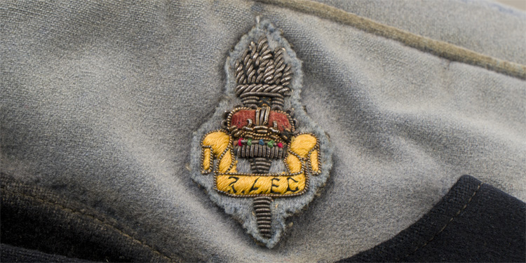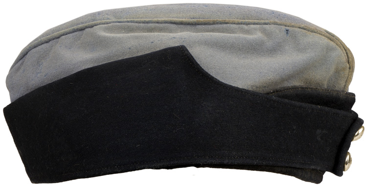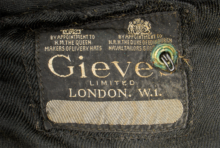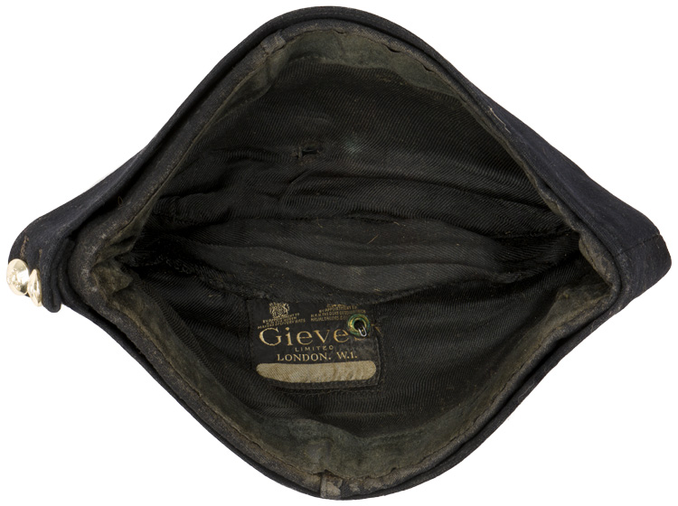 A blue grey and black wool service cap that bears a pair of modern, small "RAEC" buttons to the front, but a WWII wool and bullion badge sewn to the left side. The interior is fully lined in a black ribbed silk/rayon, along with a black velvet sweatband. A manufacture tag for "Gieve Limited London" is sewn to the lining.
