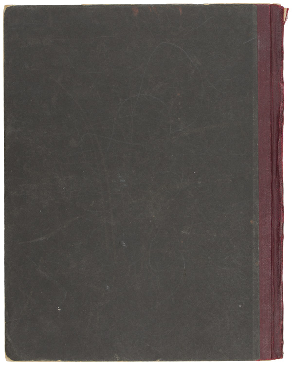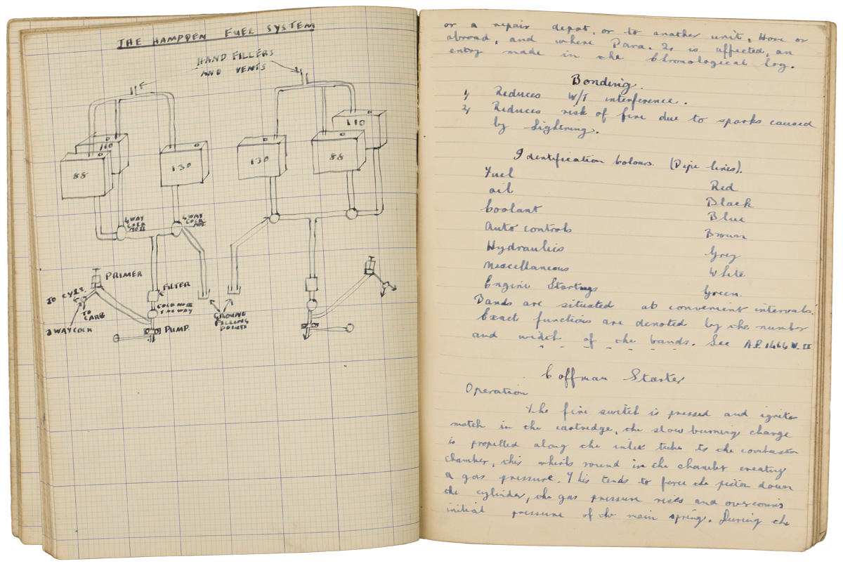 A 19.5cm x 25cm hardcover notebook with the owner’s name written to the outside. To the interior are numerous pages of handwritten notes and drawn diagrams. The covers show typical usage and wear.