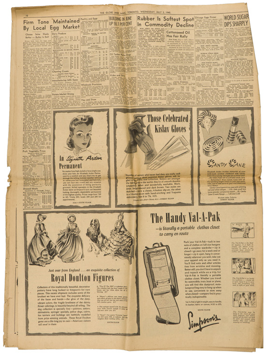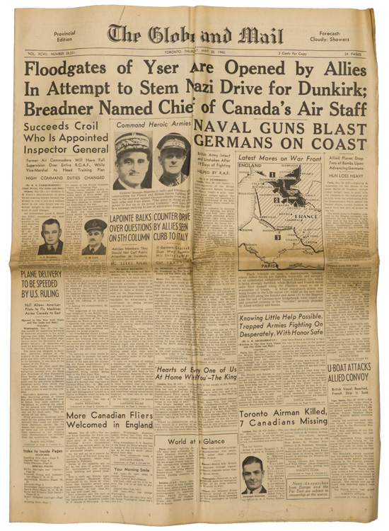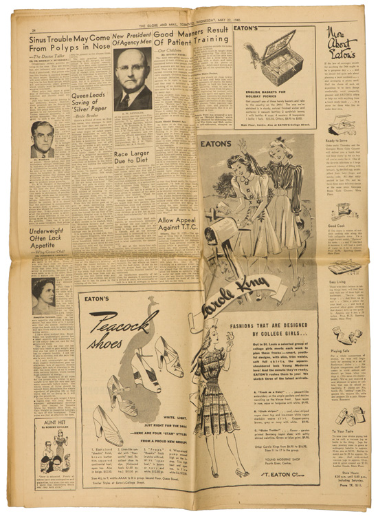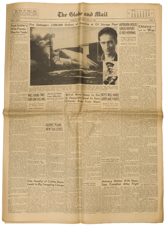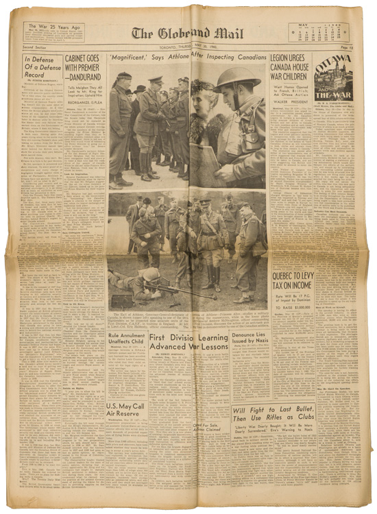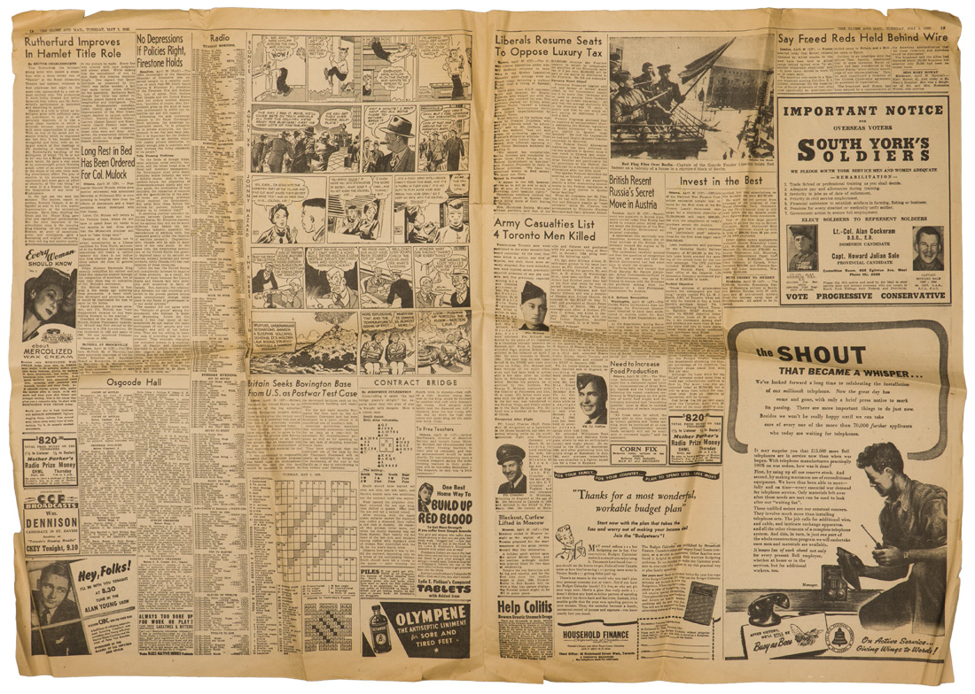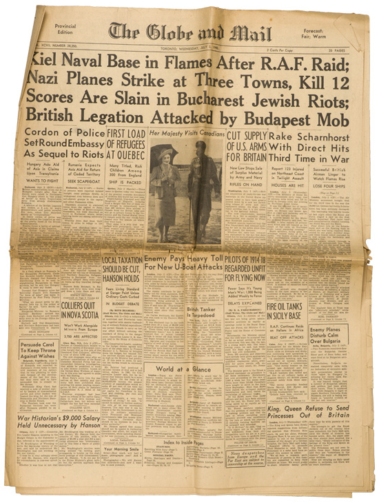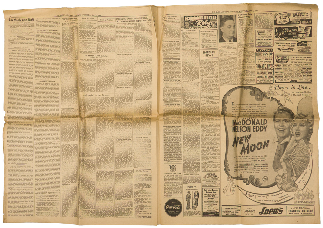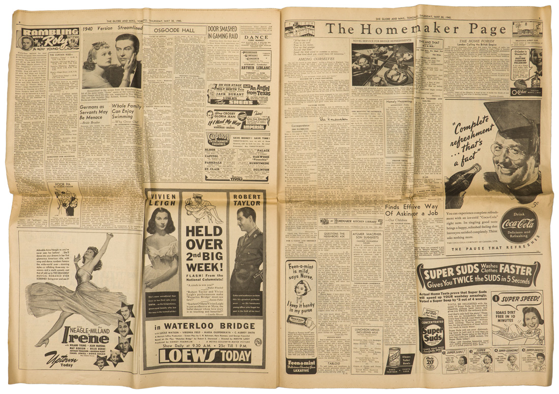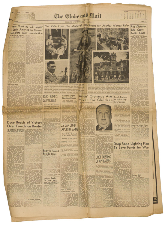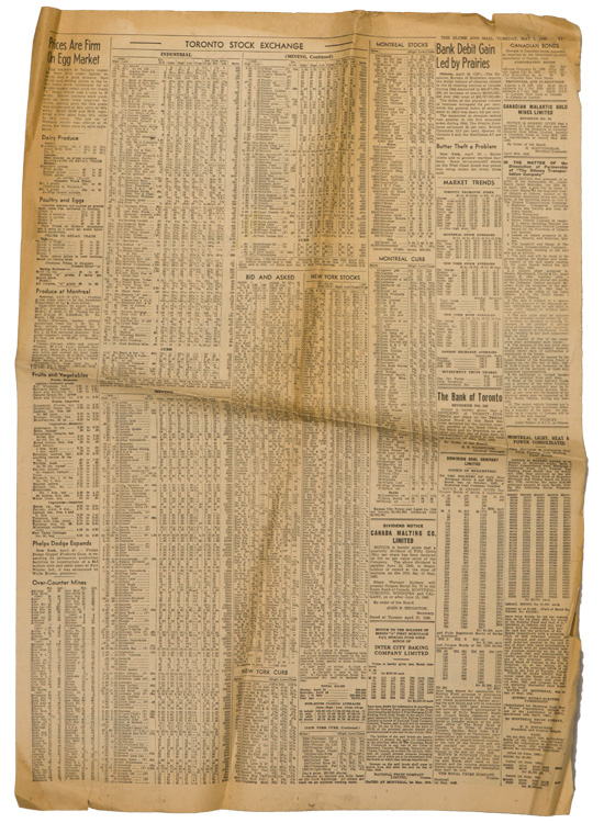 A group of six issues of "The Globe and Mail" from Toronto Ontario all dated for 1940. Also included is a copy of the "Canadian High News" dated for 1956 and two pages from "The Globe and Mail" dated May 1, 1945 that shows the Toronto Stock Exchange. All show varying degrees of usage and wear. Stored folded.