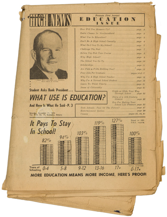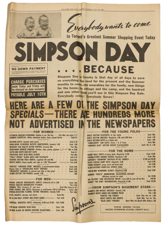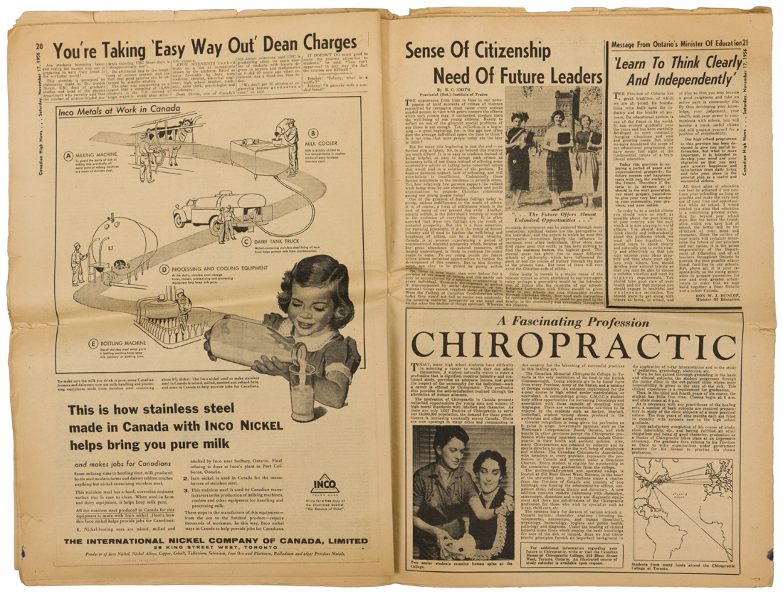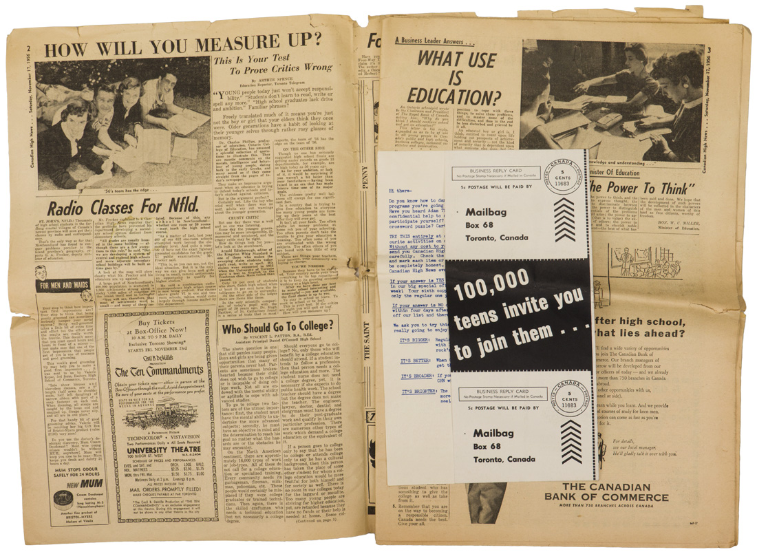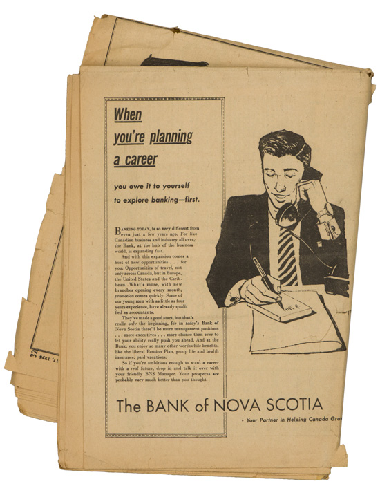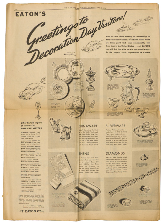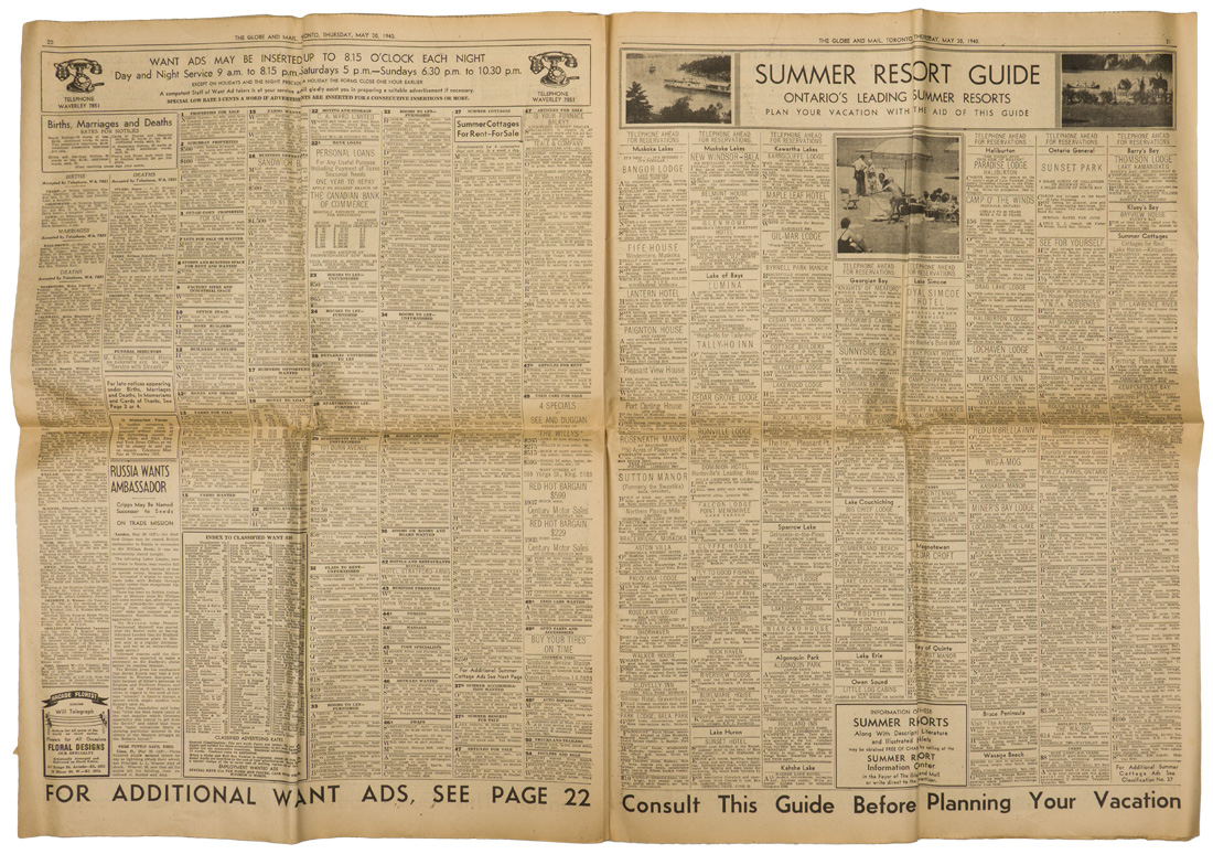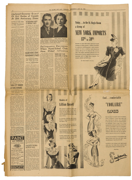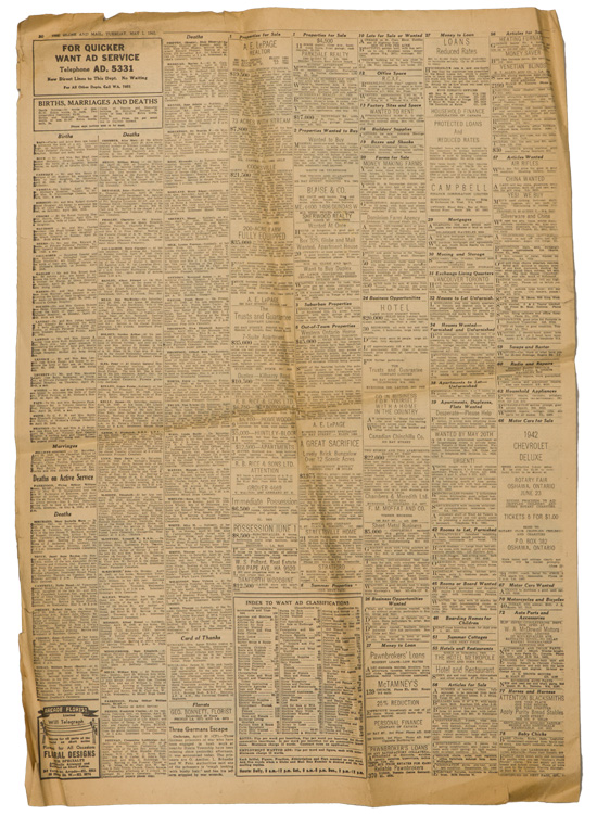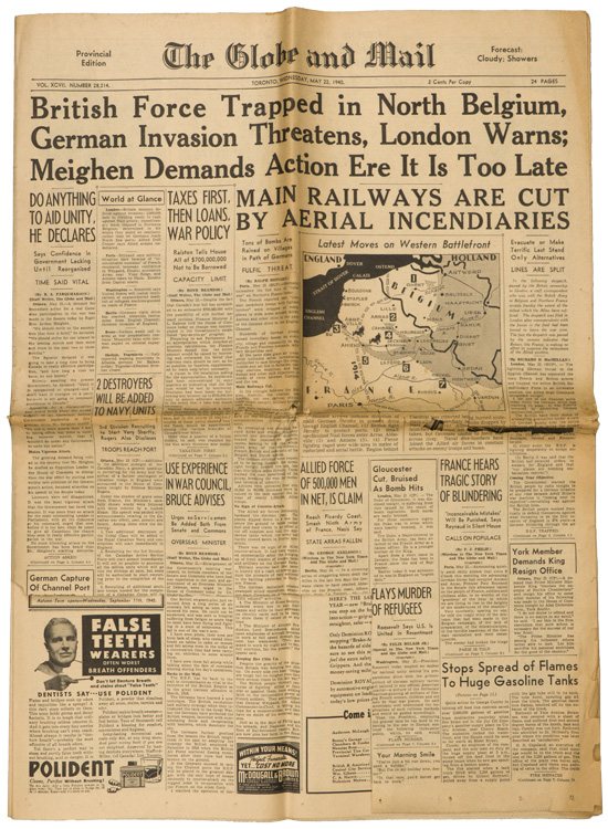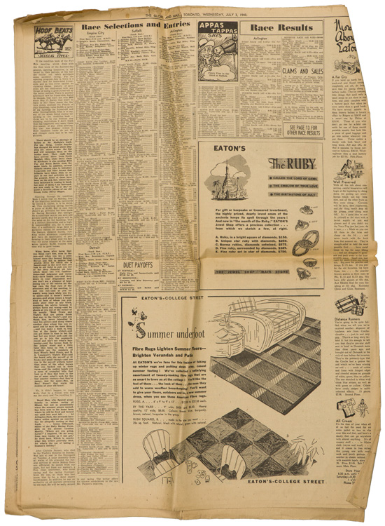 A group of six issues of "The Globe and Mail" from Toronto Ontario all dated for 1940. Also included is a copy of the "Canadian High News" dated for 1956 and two pages from "The Globe and Mail" dated May 1, 1945 that shows the Toronto Stock Exchange. All show varying degrees of usage and wear. Stored folded.