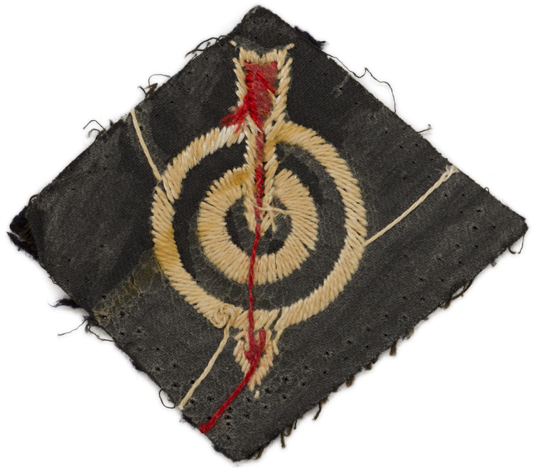 A machine embroidered black wool badge measuring approximately 5.5cm x 5.5cm featuring a white bullseye with a red arrow through the center. The badge shows fraying to the edges and appears to have been removed from a uniform. A nice example.