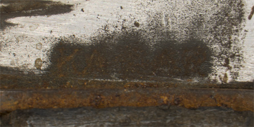 A blued fighting knife and mid-brown leather scabbard. The knife’s 18cm blade, with swedge and short fuller. The blued double crossguard is stamped ""Ka-Bar" to one side and "U.S.M.C." to the other. The horizontally ribbed, brown leather grip exhibits period wear and use. To the top of the blued steel pommel may be seen the end of the tang. Shows moderate/heavy usage and wear.