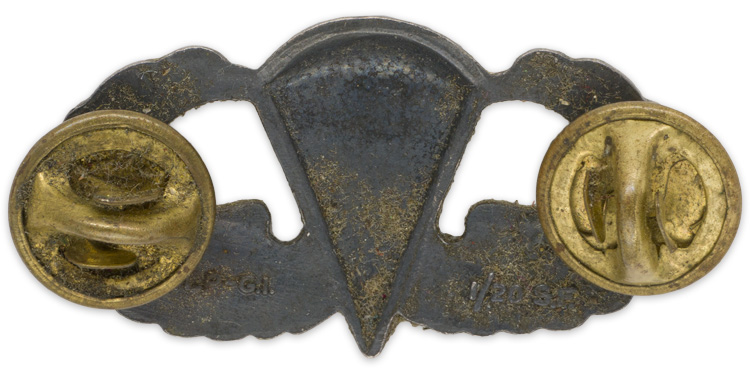 A winged parachute badge measuring approximately 4cm x 2cm with a pair of pins and pinch clips to the reverse.