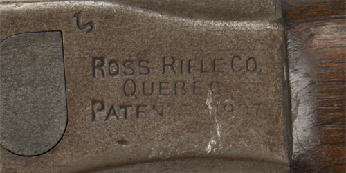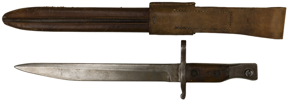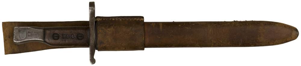 DESCRIPTION: A Mark II knife/bayonet. The wooden grip is held in place by a pair of screws. Pommel is marked "Ross Rifle Co., Quebec. Patented 1907". The brown leather scabbard is marked with a 1916 date, "M.K II" along with a "C" broad arrow.