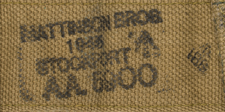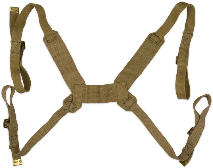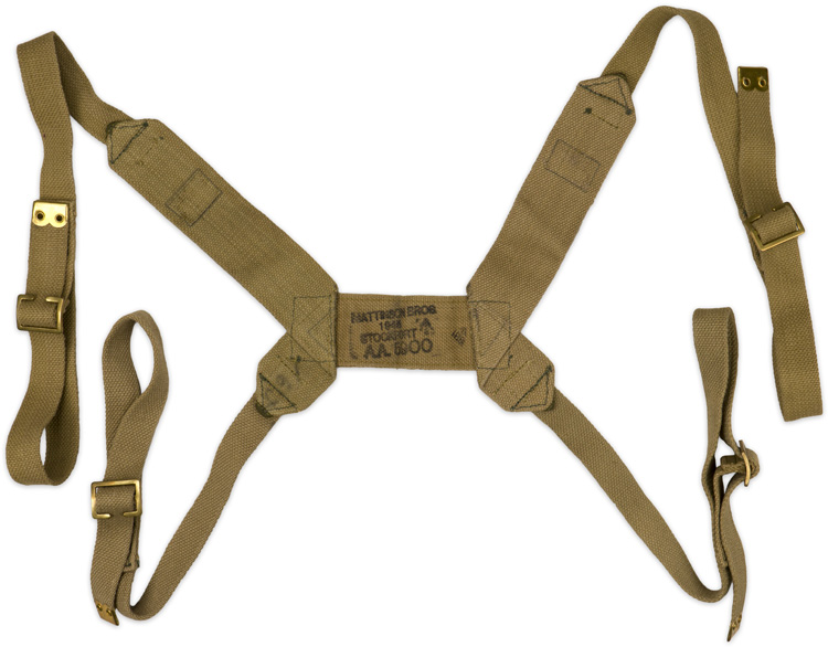 This webbed harness is designed to carry two mortar or P.I.A.T. bomb carriers. The yoke measures approximately 5cm wide and 17cm long with four 2.5cm wide straps with adjustable brass buckles that are designed to loop back on themselves afterbeing passed through the handle of the item needed to be carried. The yoke is stamped with a broad arrow, along with a 1945 date. Un-issued.